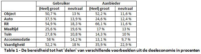 De resultaten laten een behoorlijke bereidheid zien. Er is variatie tussen de verschillende voorbeelden van de deeleconomie maar gemiddeld wil 43,8 procent deelnemen als gebruiker (dus iets lenen, huren, kopen van een ander) en 31,9 als aanbieder (dus iets uitlenen, verhuren, verkopen aan een ander). Maar liefst 84,1 procent van de respondenten zou op zijn minst aan één van de gevraagde voorbeelden mee doen. Twee op de drie respondenten zou een buurtgenoot mee laten rijden en vier op de vijf respondenten zou zijn boor uitlenen aan een buurtgenoot. Een overzicht van alle resultaten staat in onderstaande tabel.